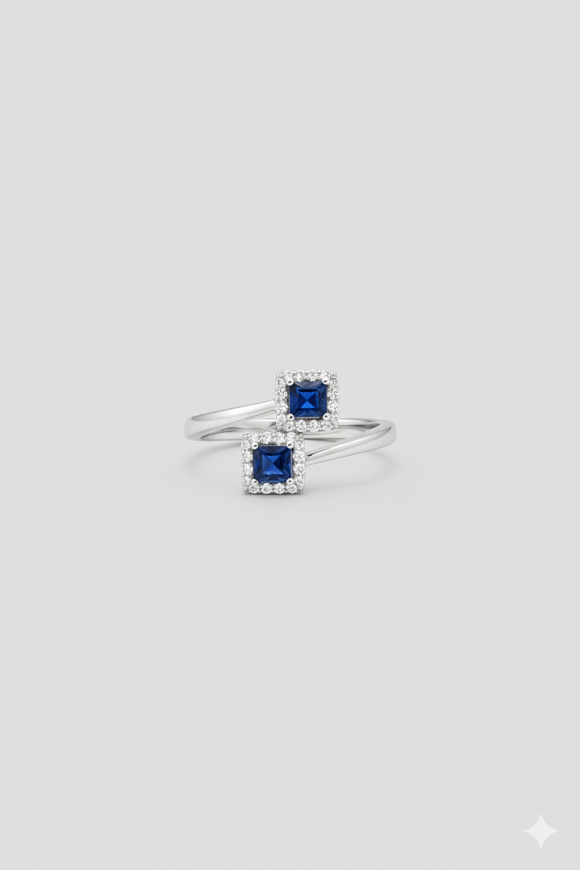 This gorgeous Thai sapphire ring is set with sparkling white diamonds. The stunning cluster of stones catches the light and reflects it back, mesmerising onlookers. The smooth bypass band accentuates the ring’s high-quality materials, making it a timeless classic.