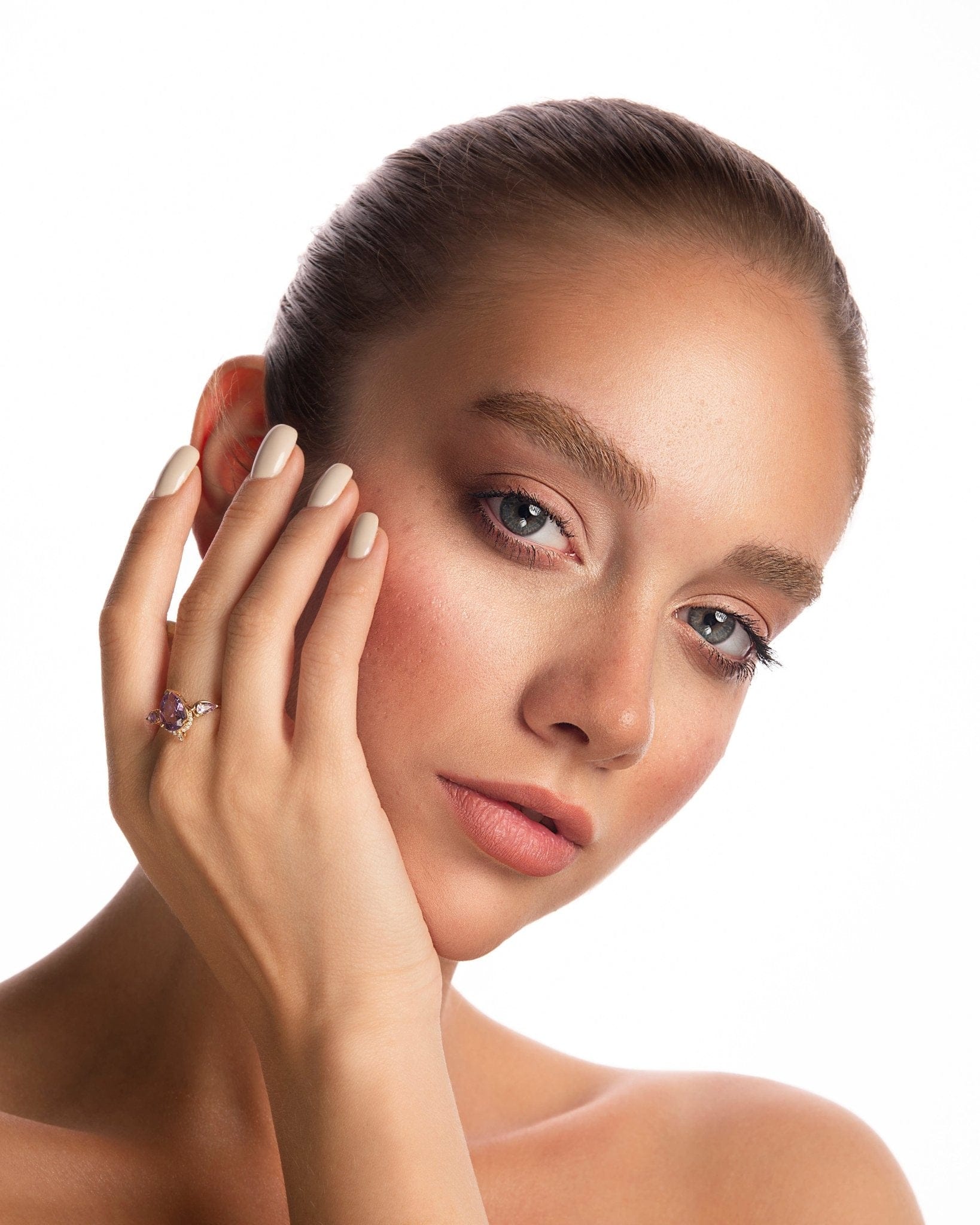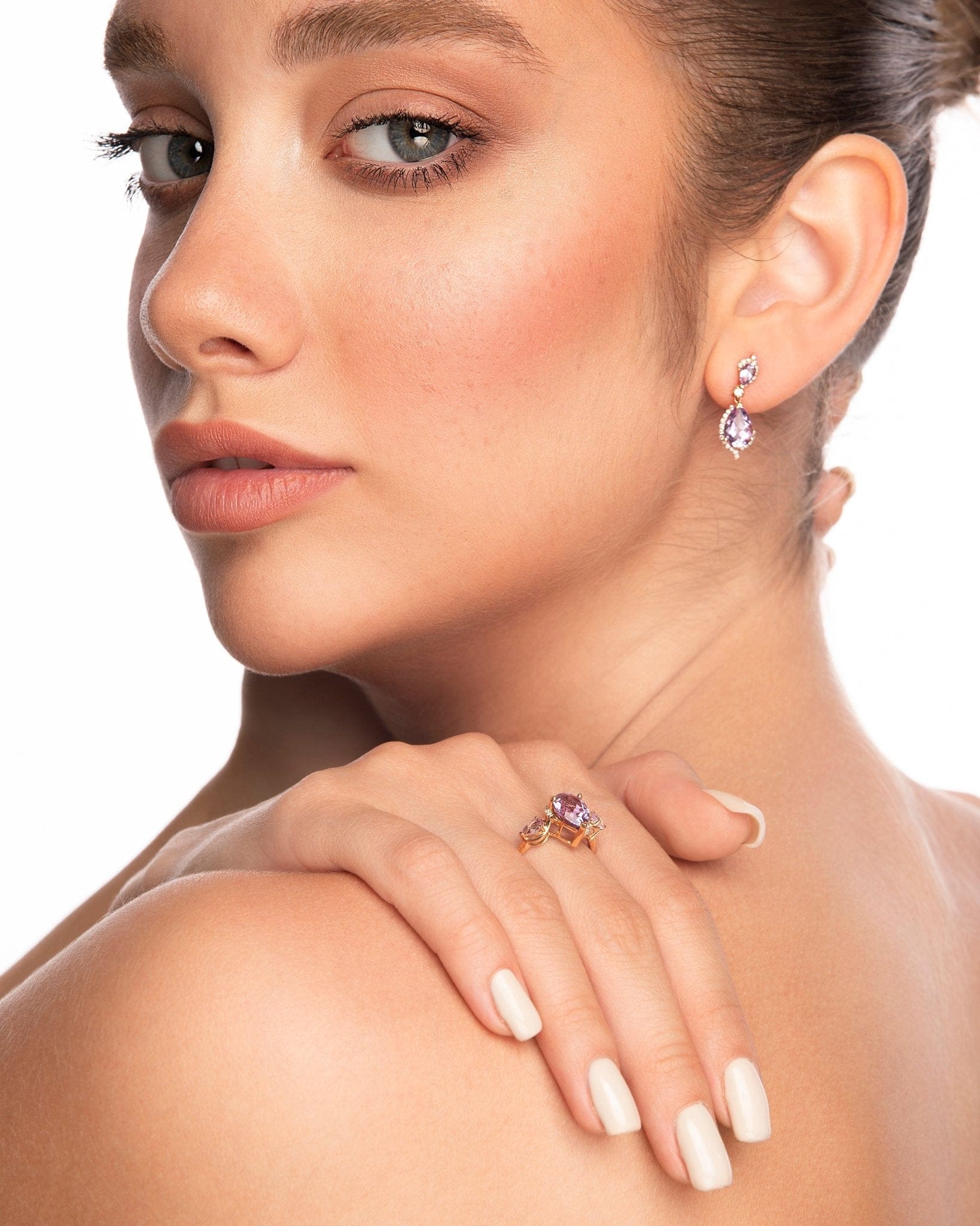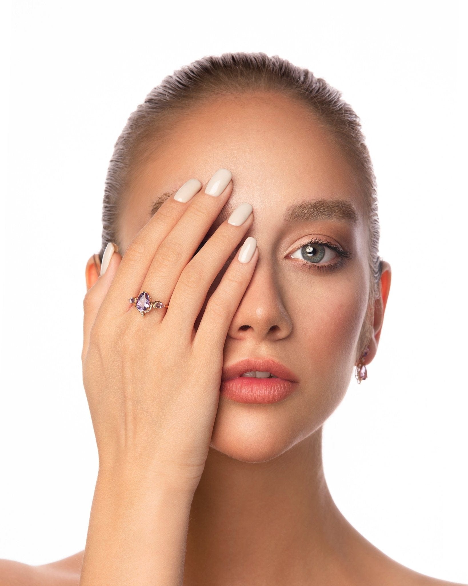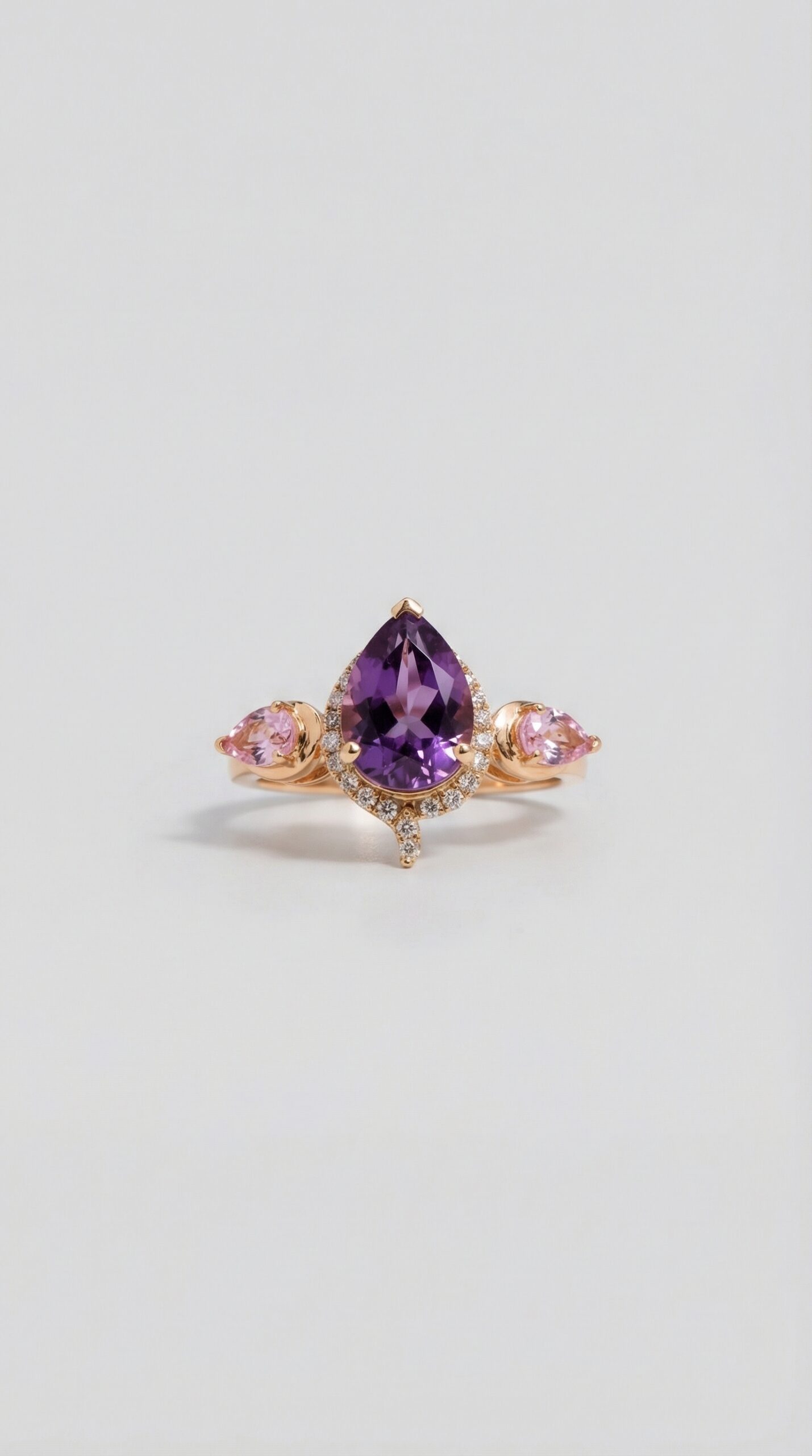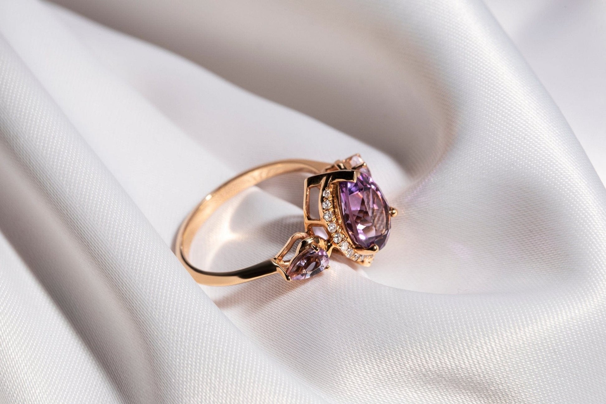 This ring celebrates the beauty of amethyst and diamond as the most covetable piece of jewellery. The intricate prong-set diamonds rhythmically blend with the delicate organic shape of the stones to create a one-of-a-kind masterpiece that is sure to steal hearts.