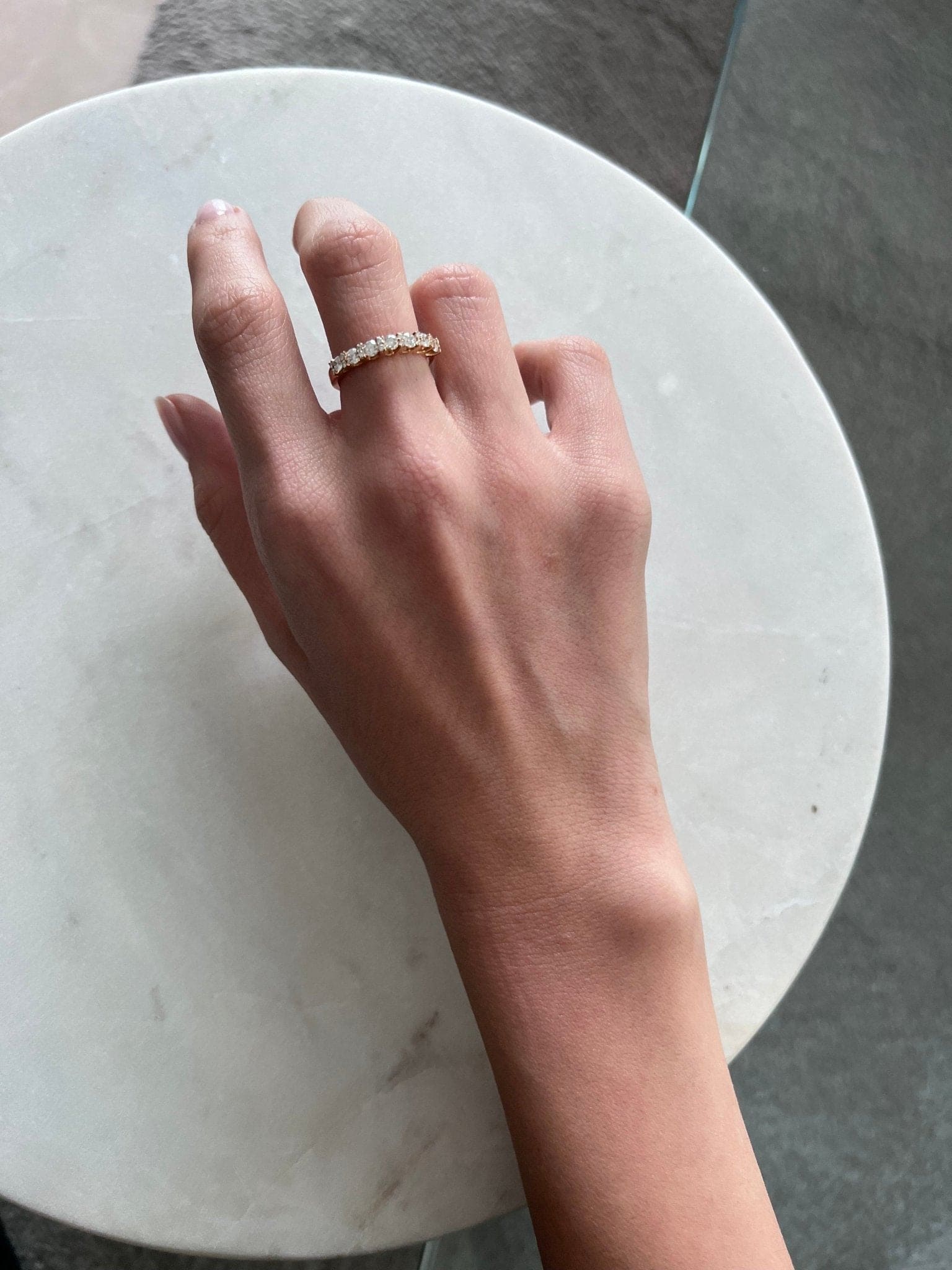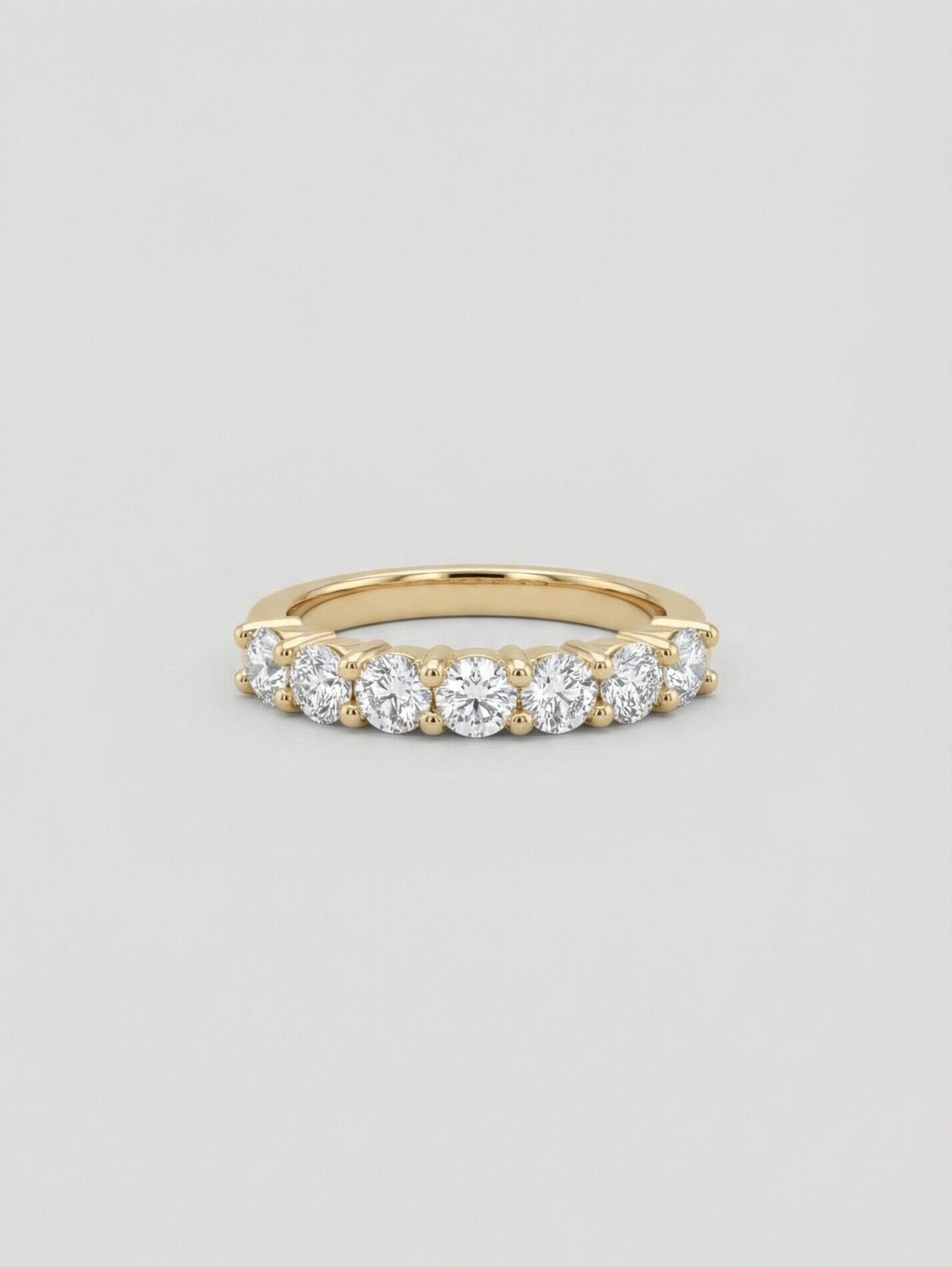 With the perfect balance of feminine quality and sophistication, this band is an excellent choice for any occasion. Finely lined up diamonds create an array of shimmering lights, while the delicate prong setting displays every facet of the diamond’s beauty and brilliance. Stack and pair it with other rings, or wear it as a statement piece alone.