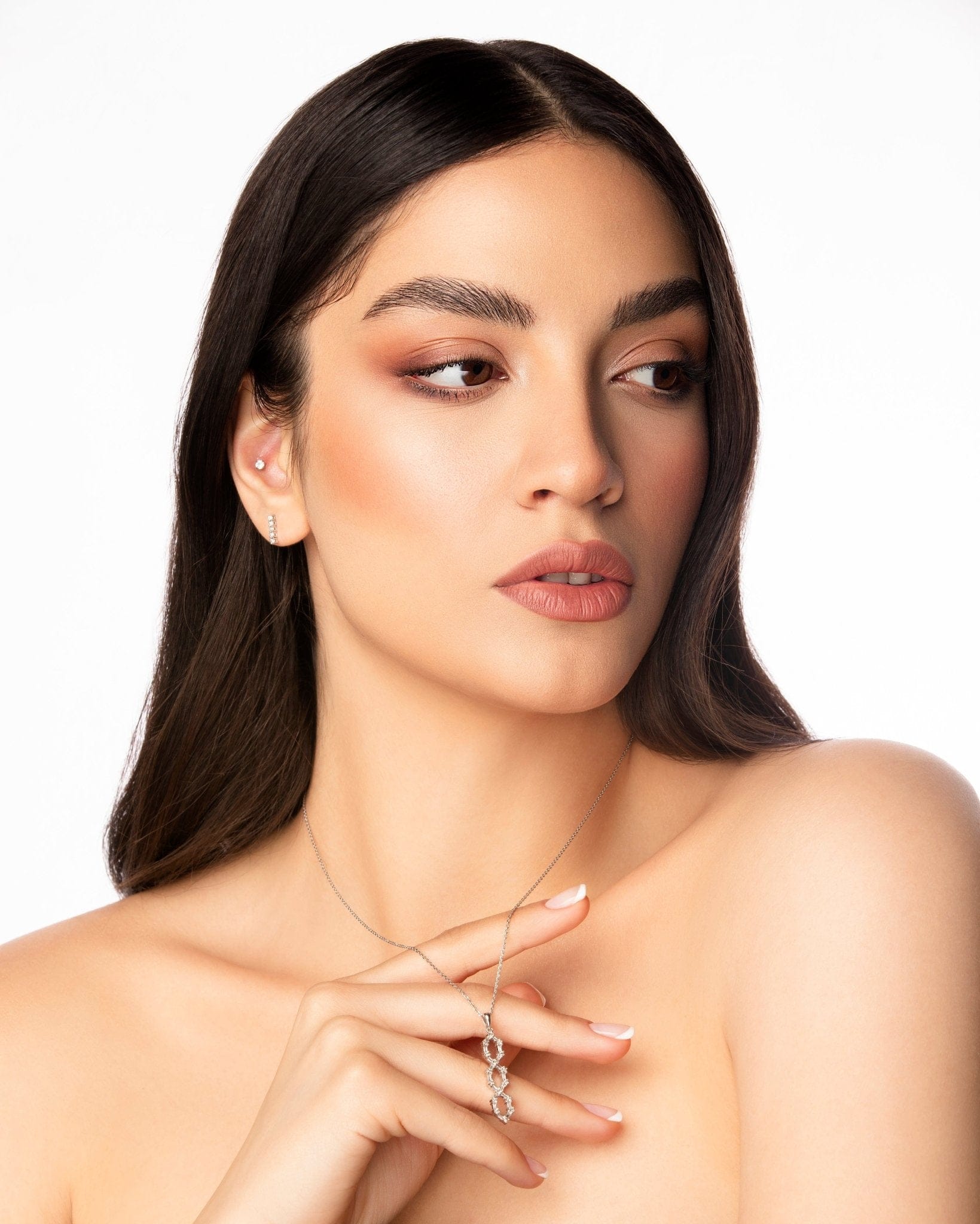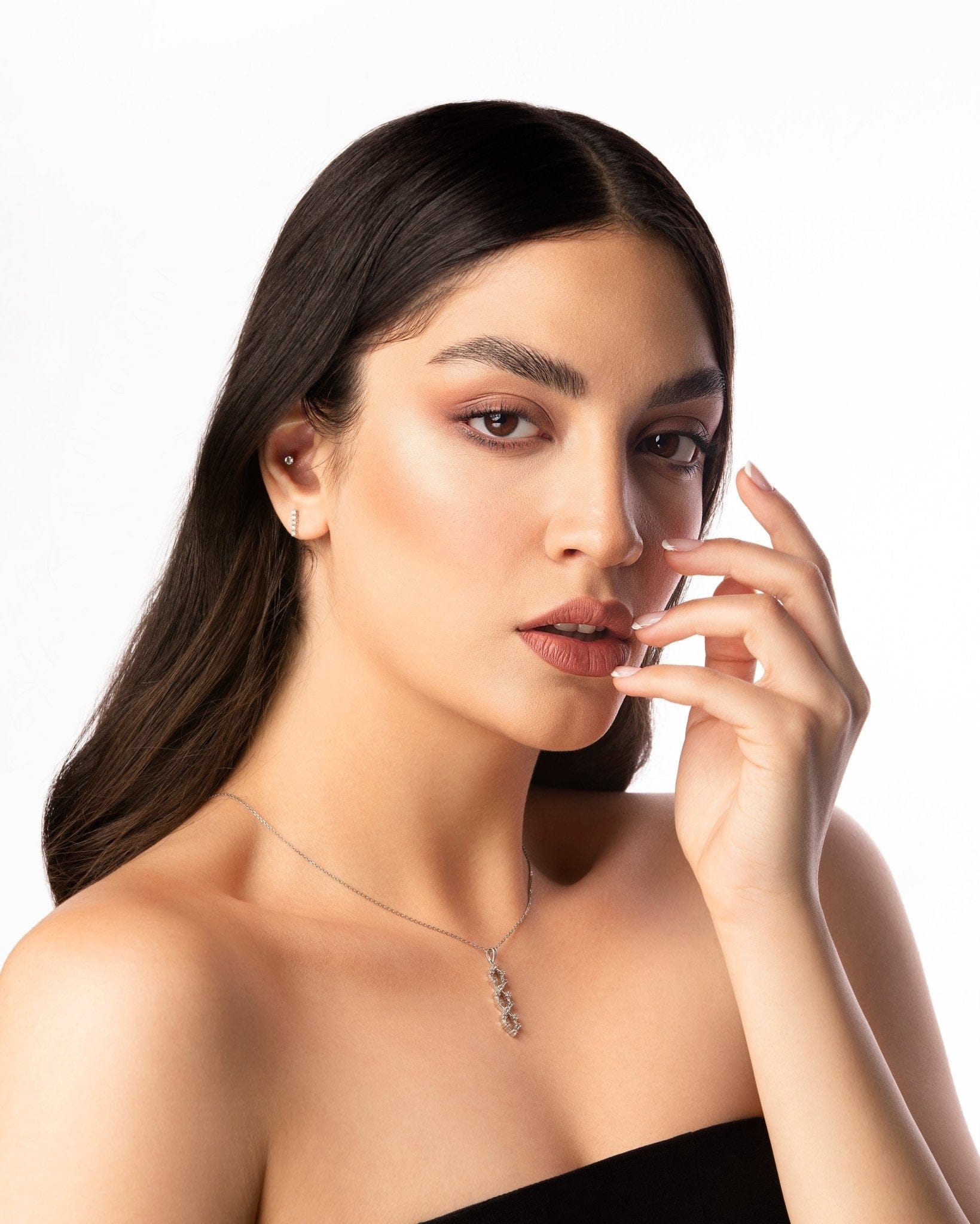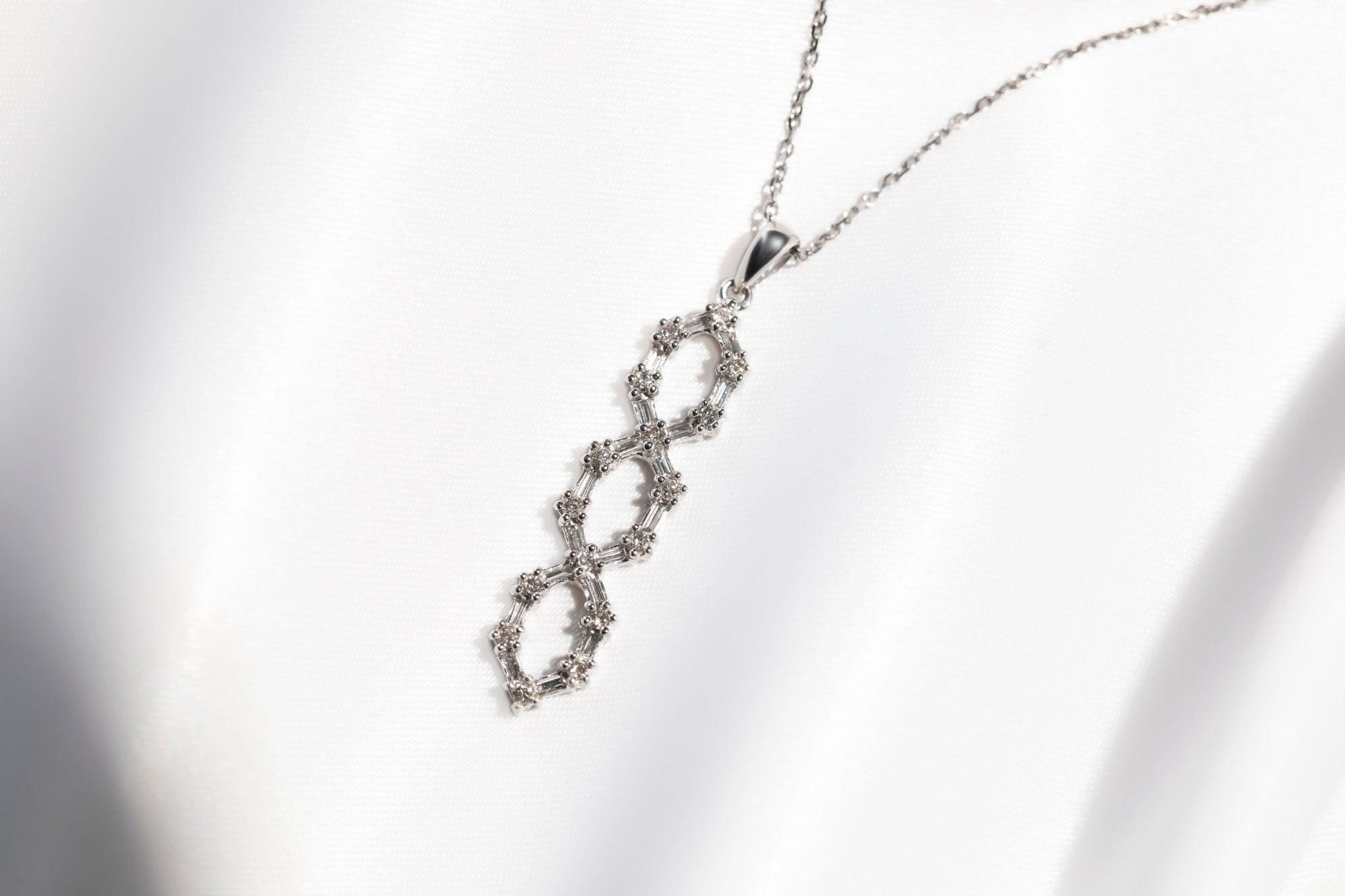 This unique necklace pendant is a timeless piece in our collection. The charm shines with 18 white baguettes and 16 finest white diamonds, perfect for any special occasion. Designed to be as modern as it is timeless, the pendant is a tribute to the unique moments that connect us throughout our lives, resulting in the symphony of our stories.