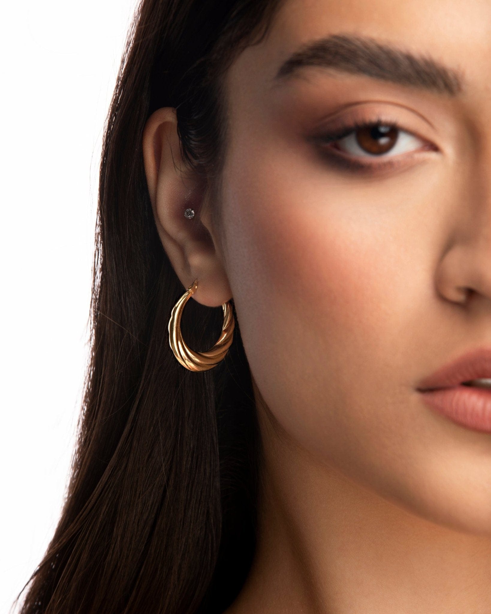 This unique crossover design in our hoop earrings perfectly aligns with the inspiring maximalist aesthetic. You can wear them independently or add another pair of earrings to create a striking ear stack.