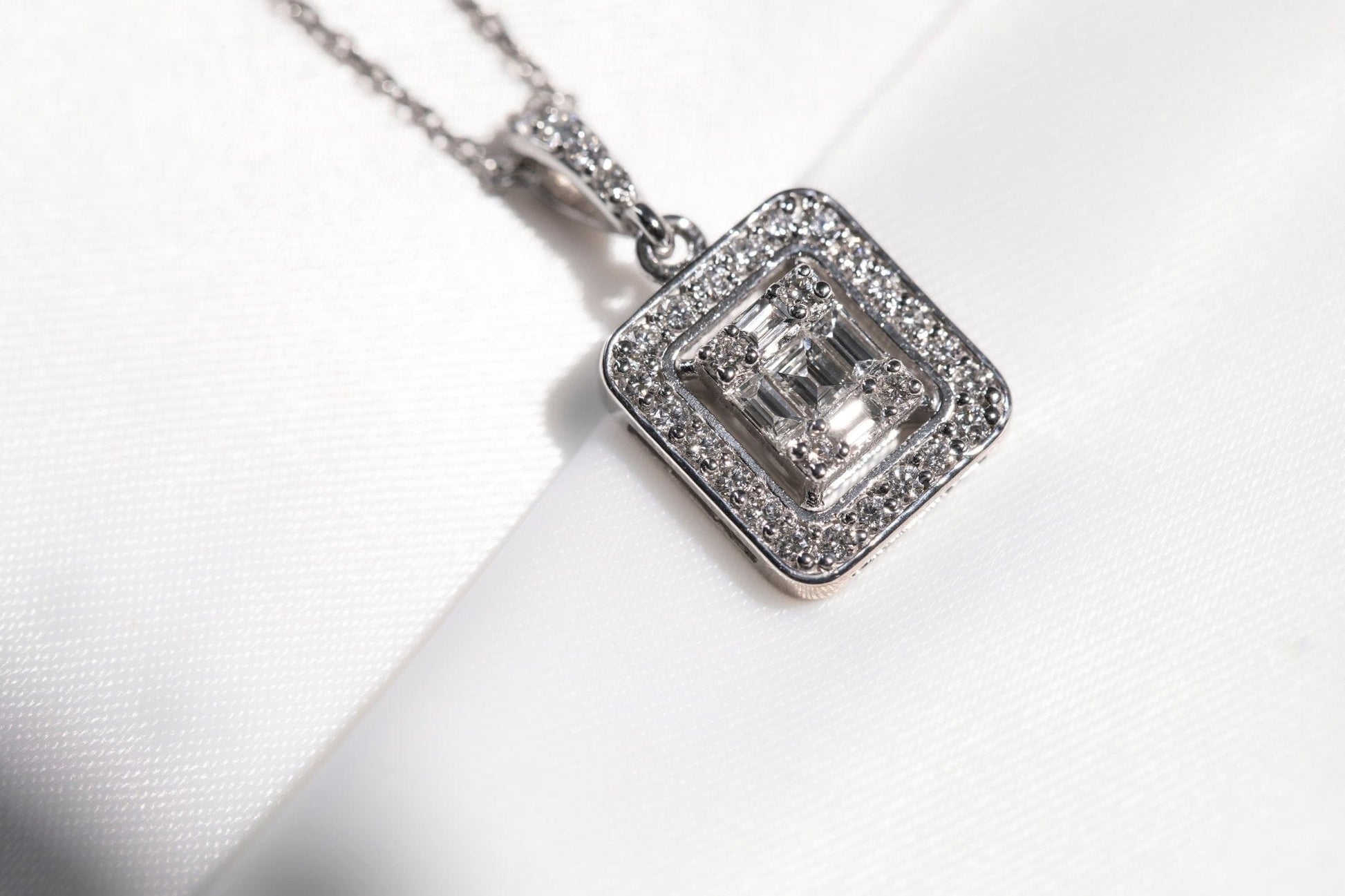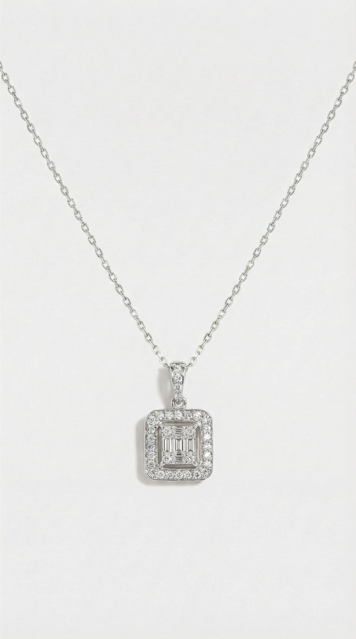 Enchant and dazzle with this gorgeous pendant made from white gold, crafted with 30 first-class white diamonds. The diamonds are accented with surrounding baguettes for added shine and sparkle. The pendant’s rectangular form makes this piece a modern addition to your collection.