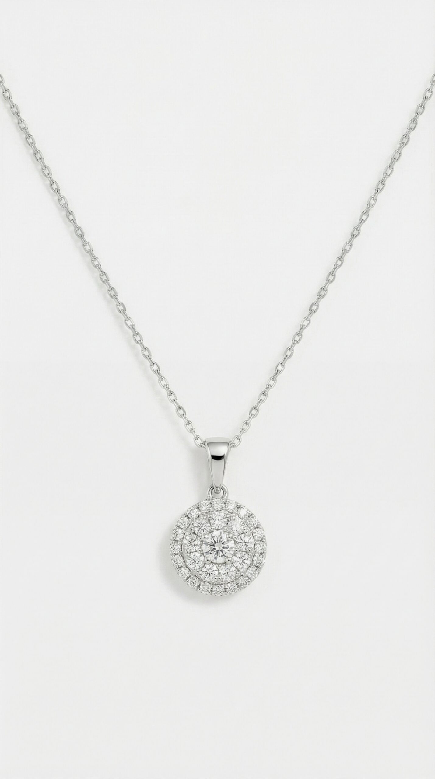 If you’re looking for that perfect formal jewellery piece, look no further than this classic pendant. The white diamonds of 0.23 carat are set in a brilliant round of sparkling accents, making this piece an iconic addition to your collection.