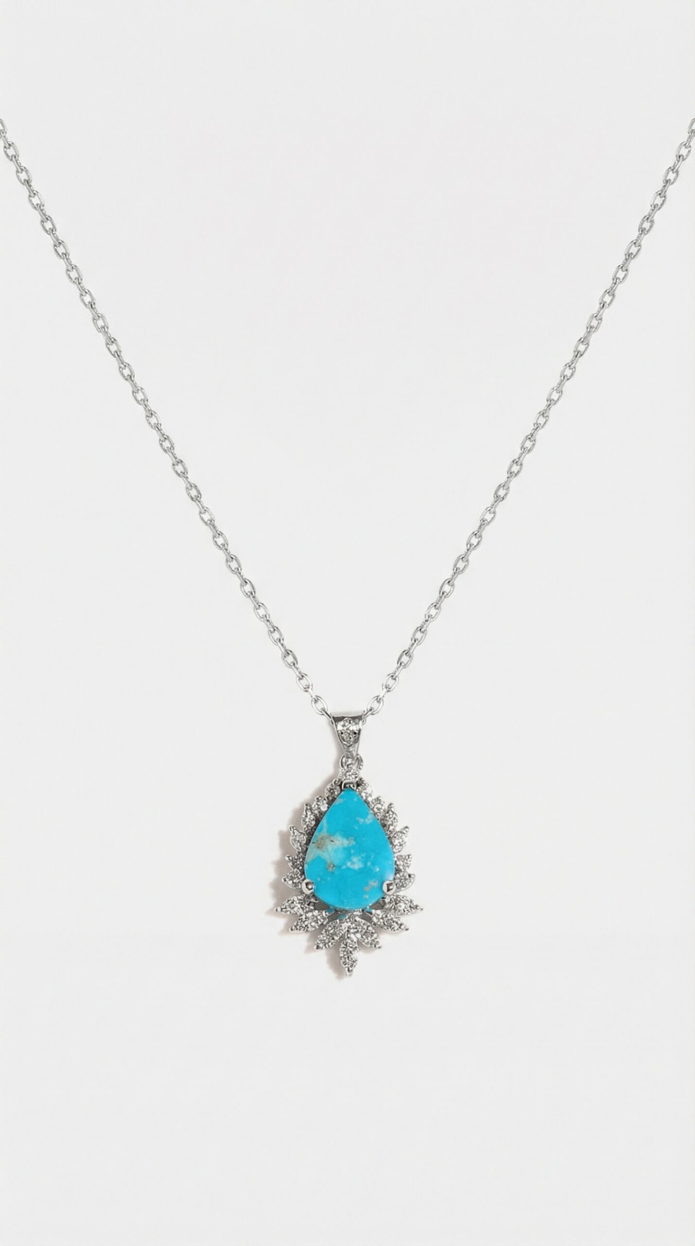Add a unique piece to your jewellery collection with this Turquoise Pendant. A tear-cut turquoise stone is set with 18 white diamonds that are hand set, creating a leaf motif on this stunning piece. The pendant is encrusted with diamonds drop by drop, which makes it shiny, sparkly and long-lasting. This stunning piece will add elegance to any outfit and make you feel special daily.