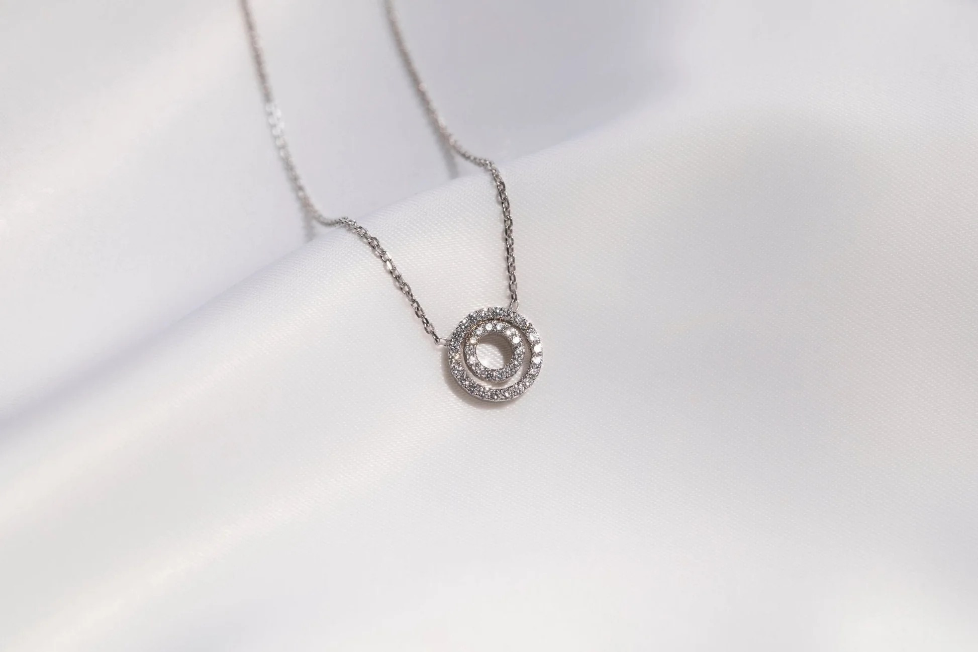 Delight in the extraordinary with our unique necklace. This double-circled frame features 36 first-class white diamonds that weigh 0.22 carats. The sophisticated combination of textured diamonds and refined lines of this design creates a statement piece for the brightest occasions. Designed to enhance your style with grace and character, this piece will bring out the beauty in any setting, from a simple day at the office to the most lavish evening occasions. Complete the look with the matching earrings in the same style.